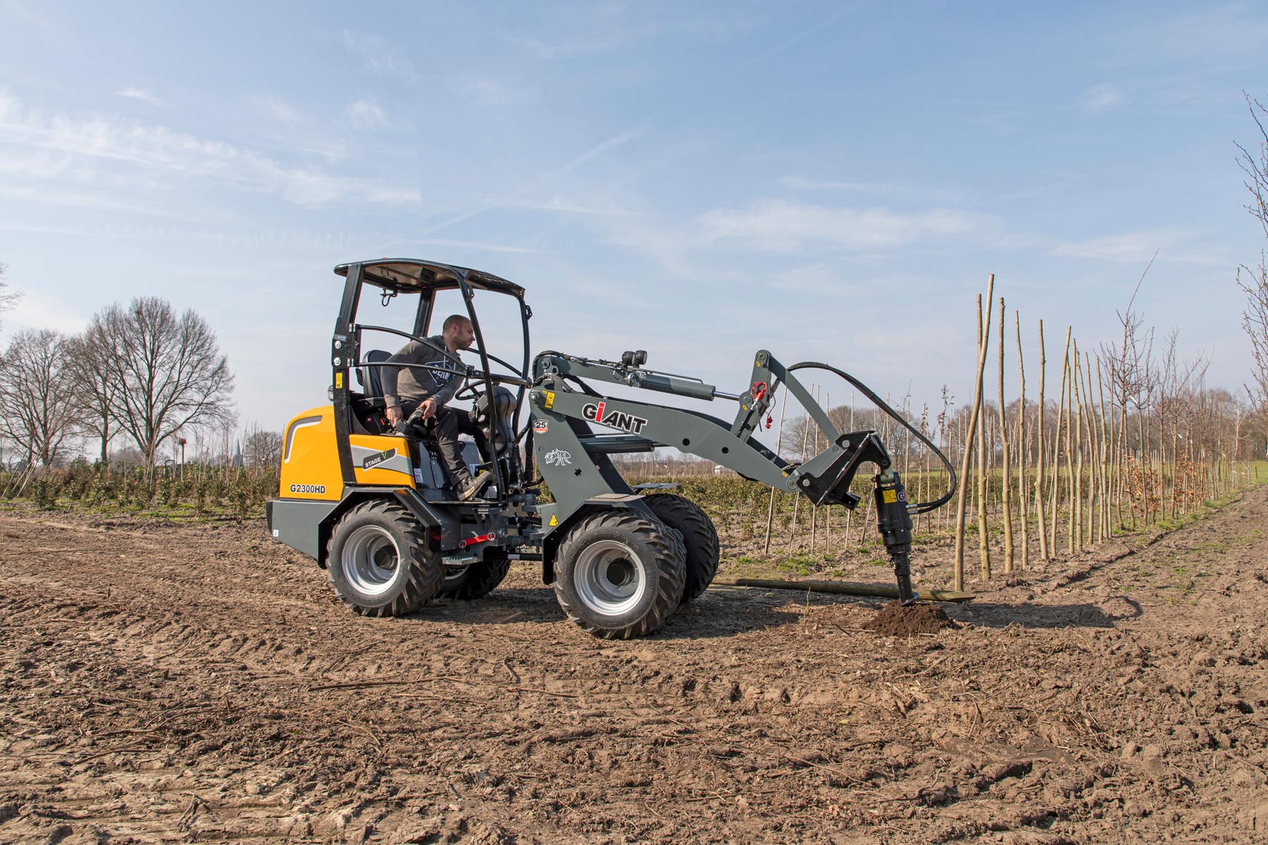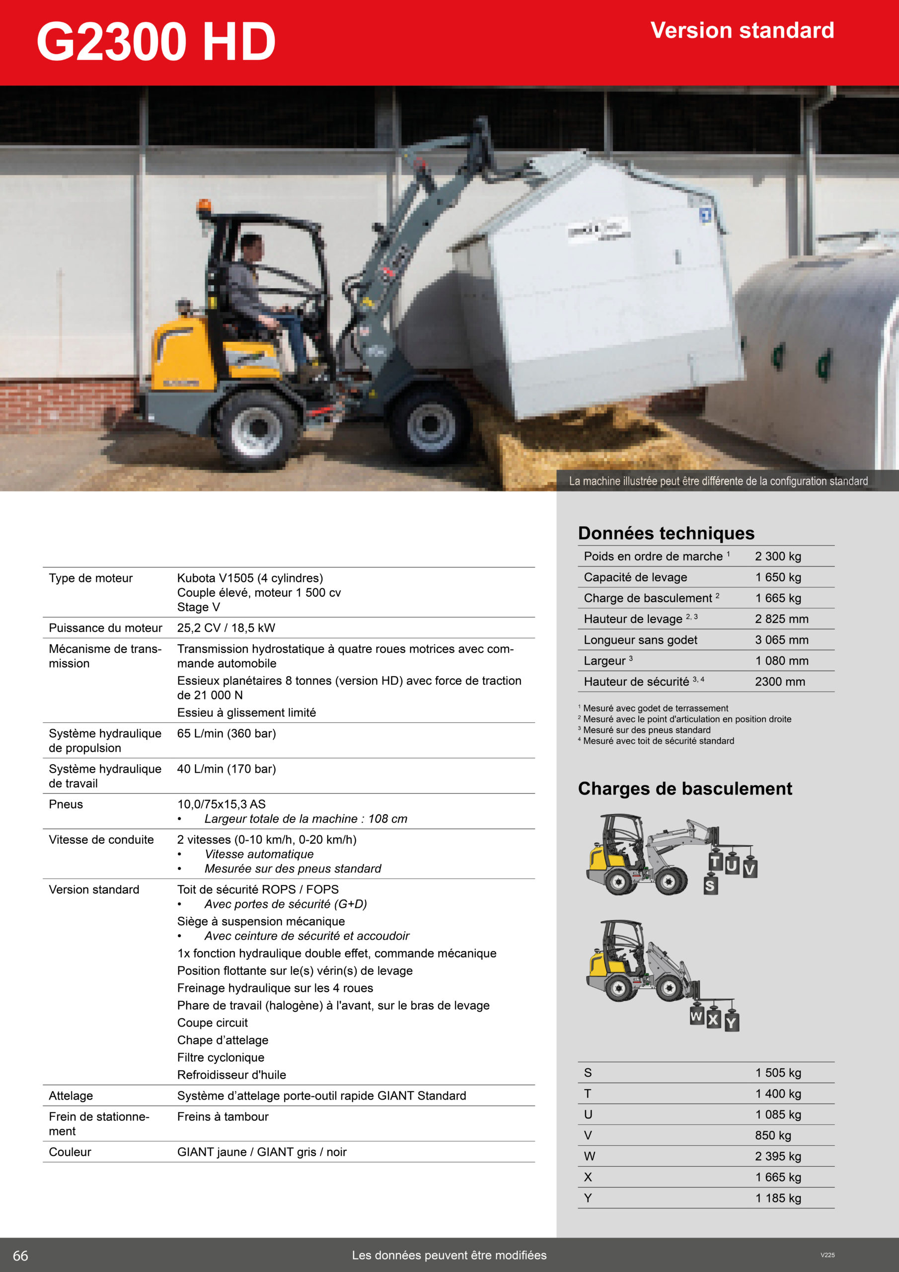 La GIANT G2300HD est une chargeuse articulée puissante de 25,2 CV, équipée de série d’essieux planétaires renforcés d’une capacité de 8 tonnes. Elle offre une capacité de levage de 1 650 kg et peut atteindre une hauteur de levage de 2,8 m, ce qui en fait une machine idéale pour les travaux exigeants.