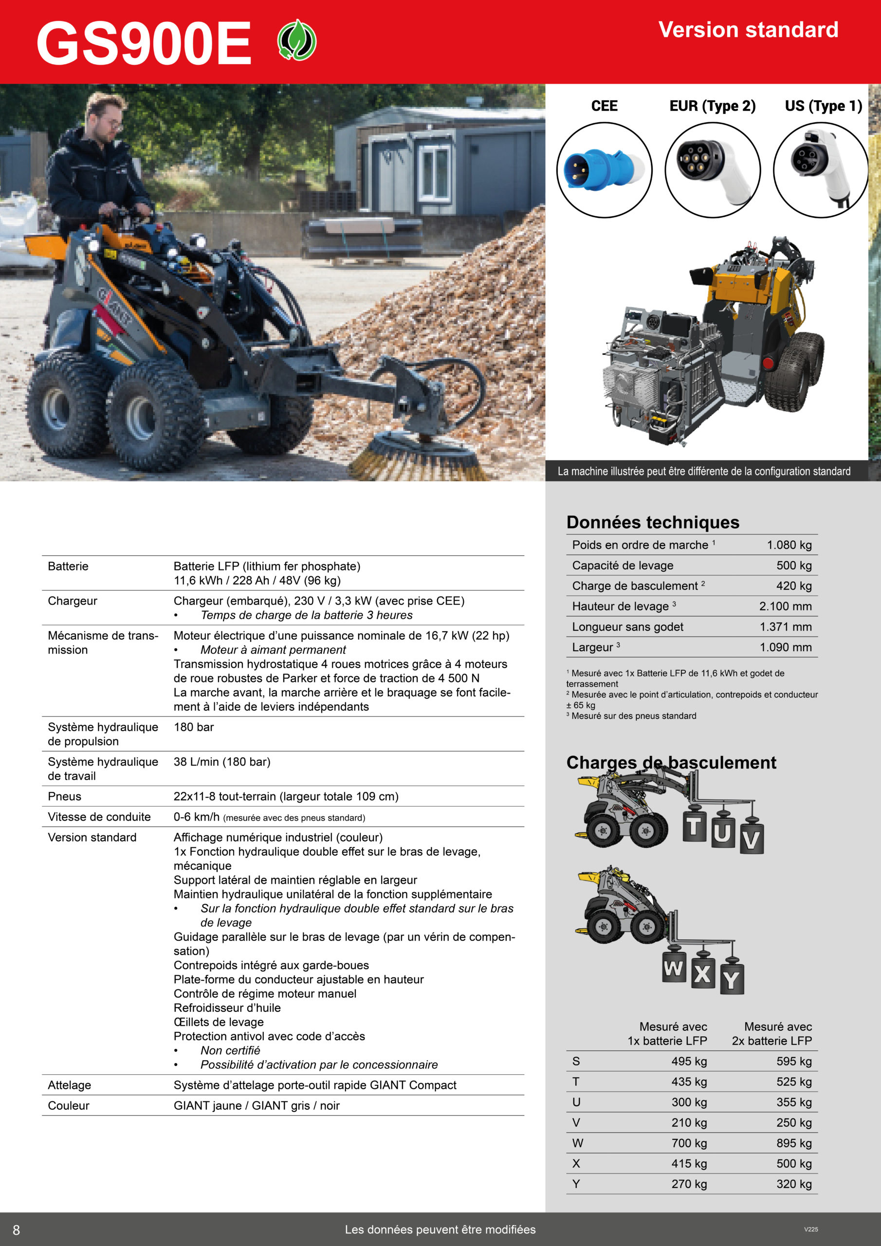 La chargeuse skid-steer GS900e, est équipé d’une batterie LFP (lithium fer phosphate d’une capacité de 11,6 kWh