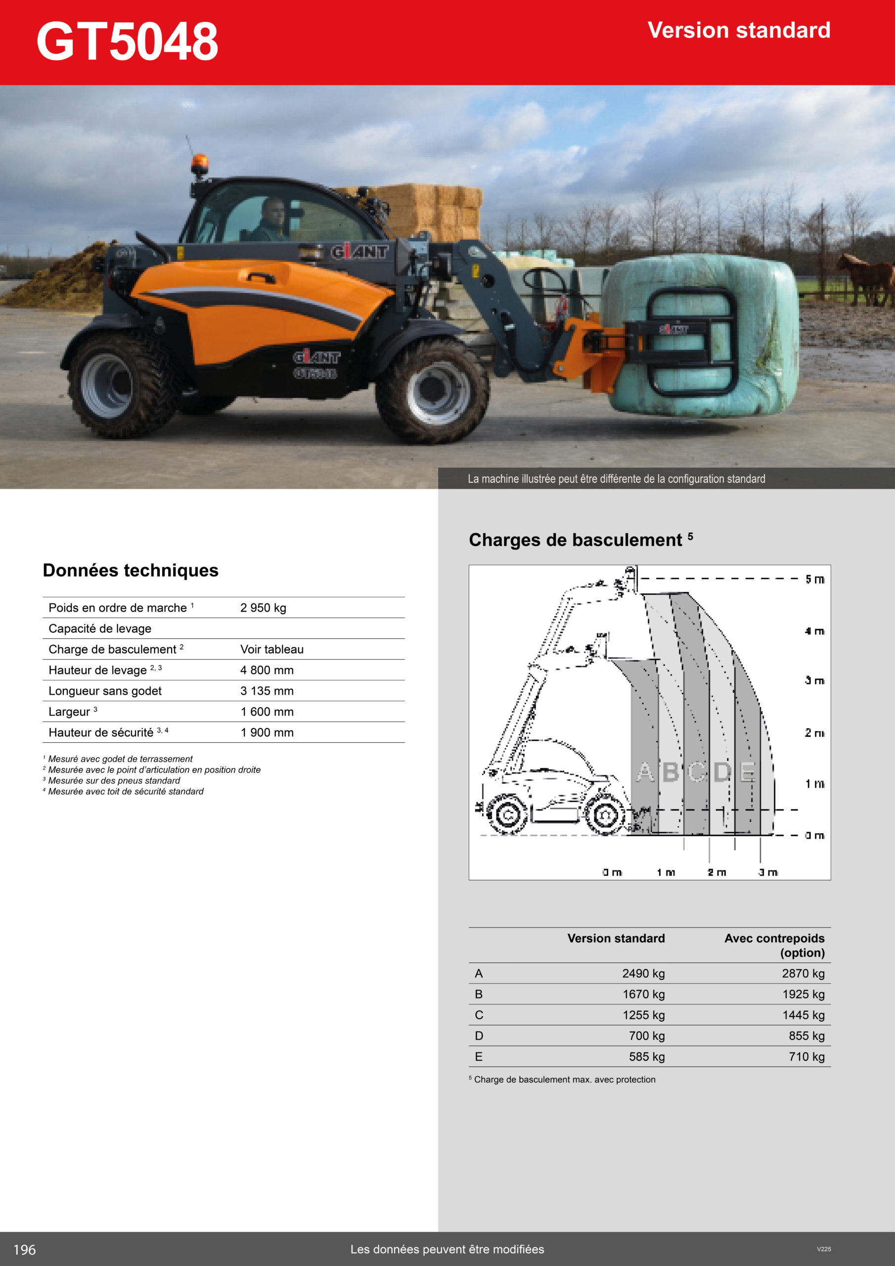 Le GT5048 est un chariot télescopique particulièrement compact, doté d’un moteur puissant de 50,4 CV conforme à la norme Stage V. Il offre une charge de basculement impressionnante allant jusqu’à 2 490 kg, couplée à une hauteur de levage de 4,8 m.